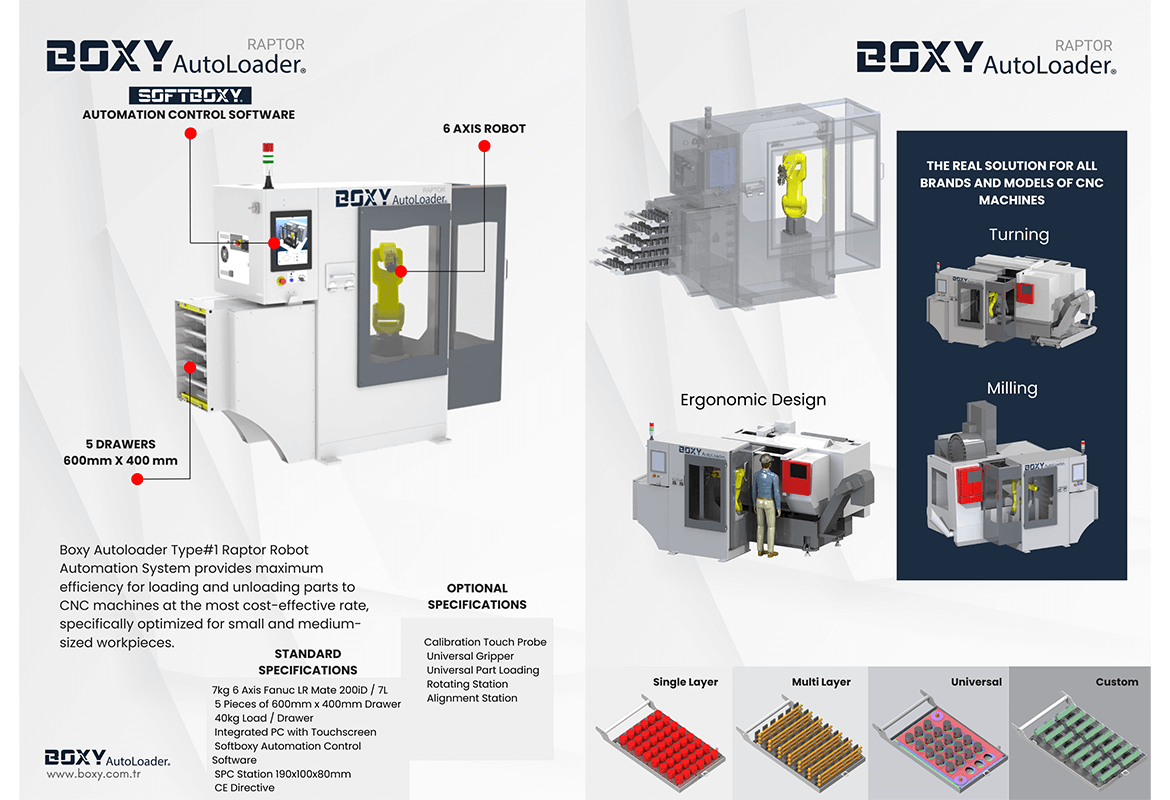 Boxy Autoloader Type#1 RAPTOR Robot Automation System brings the highest productivity to your factory for small and medium-sized workpieces with the most cost-effective method in CNC Machine part loading and unloading operations.